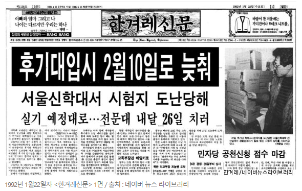 지금은 고등학교에서 수능시험을 보지만 당시에는 지원하는 대학교에 직접 가서 시험을 봤다. 시험을 (잘) 보기 위해 시험 일주일 전부터 대학교 근처 하숙집을 구해 준비를 했다. 그런데 문제가 생겼다. 시험 전날인 1992년 1월 20일에 시험지가 도난당하는 초유의 사건이 발생한 것이다. 전기 대학에 떨어진 것도 모잘라 후기 대학 시험 전 날에 시험지가 도난당하는 일이 벌어진 것이다. 시험은 2월 10일로 미뤄졌고 나는 학교 앞 하숙집에 양해를 구해 시험치르는 날까지 계속 머물기로 했다. 이 사건으로 설날에도 도서관에서 공부를 해야만 했다.