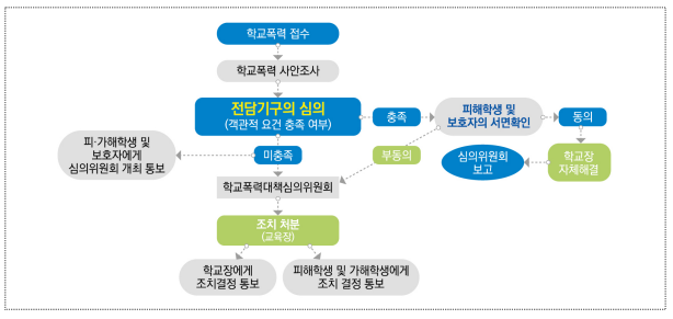 그래서 학교의 자율성이 개입될 여지가 거의 없습니다. 예를 들어 학교폭력전담기구 위원들과 학교장이 학교장 자체 종결로 처리하고 싶어도 가해자 또는 피해자가 원하지 않으면(주로 피해자) 학교폭력대책심의위원회로 회부되어 최종 조치 결과를 따라야 합니다.