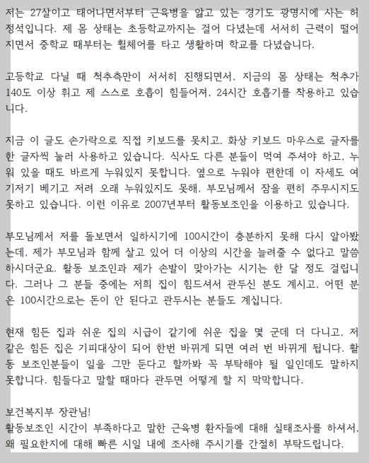 아래 글은 정석이가 쓴 죽기 4년 전 그의 나이 27살 2010년에 보건복지부 장관에게 중증장애인에 대한 실질적인 보호책을 강구해 달라는 호소문입니다.