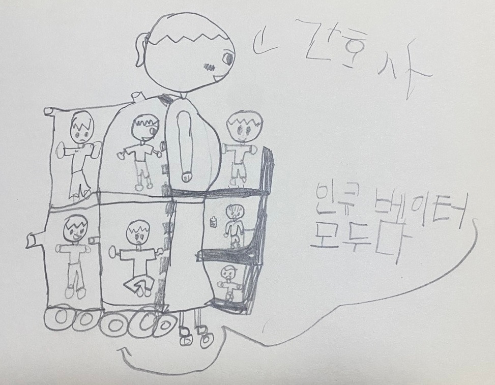 첫 번째 그림은 간호사를 그렸습니다. 아이는 지금까지도 장래희망이 간호사입니다.