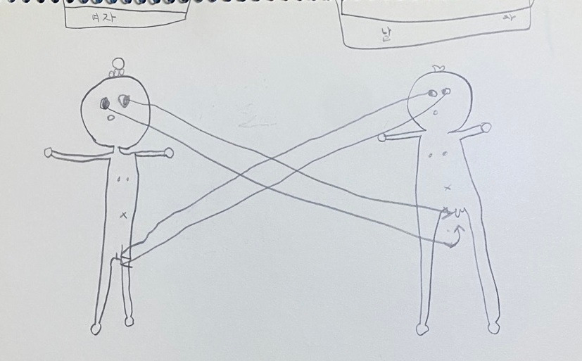 그림에 '여자', '남자'라는 단어를 쓰지 않았다면 남녀 구분을 못할 정도로 비슷합니다. 단지 남녀 성기 모습만 살짝 다를 뿐. 두 사람의 눈이 상대방의 어디를 쳐다보고 있는지 아예 대놓고 '화살표'로 알려주고 있습니다. 저도 이 그림을 처음 봤습니다.
