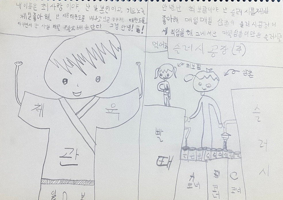 오른쪽 아이의 이름은 '최보람'입니다. 삼촌이 슬러시 만드는 공장에 다닌다고 합니다. 기존 우리 아이의 그림을 보면 유난히 슬러시를 파는 푸드트럭을 많이 그렸습니다. 예나 지금이나 슬러시를 무척 좋아한답니다. 아마도 초등학교 1학년 때부터 삼촌이 슬러시를 만드는 직업이길 바랐나 봅니다. 아빠는 선생님이라 슬러시를 못 만드니까요.