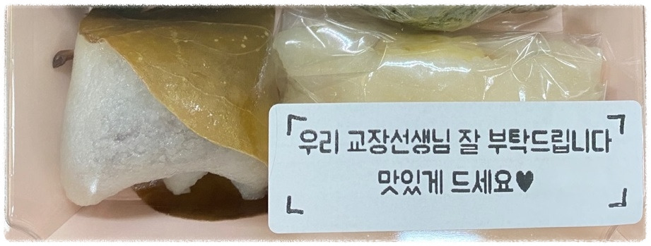 사르르 보자기가 풀리고 드디어 상자가 열리는 순간 모두는 "우와 우와"하는 감탄사가 저절로 흘로 나왔다. 그 안에는 보기에도 맛있어 보이는 각양각색의 떡들이 있었다. 감탄사가 나온 건 이 떡 때문이 아니었다. 작은 상자의 뚜껑에 써져 있는 사위에 대한 어머니의 사랑 가득 담긴 메시지 때문이었다.