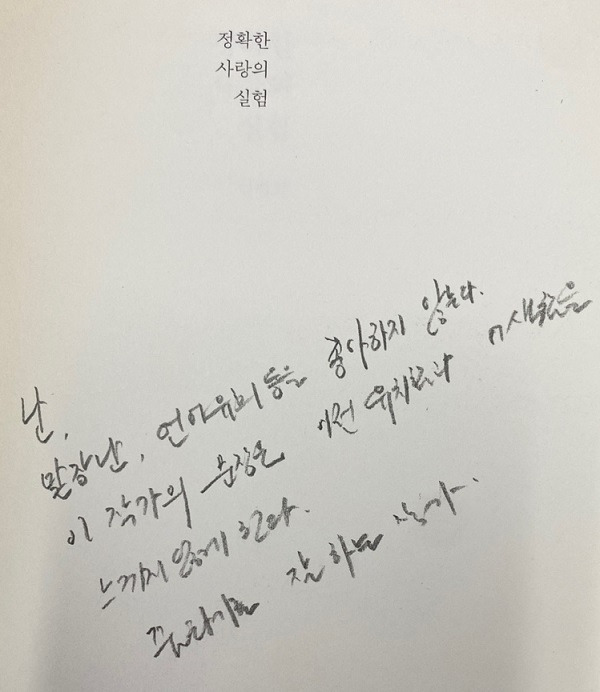 노이즈캔슬링 잘 되는 에어팟을 귀에 꽂고 피아노 연주를 들으며 창가에 기대어 책을 읽는 것을 좋아한다. 모든 사람이 핸드폰을 보고 있어 나만 유별나게 책을 읽는 척하는 것이 아니다. 직장에서도 집에서도 책을 편히 읽을 수 없는 상황이기에 출퇴근 시간 지하철에서 읽고 싶은 책을 보는 것이 좋은 것뿐이다. 오늘은 7년 전에 읽었던 신형철 작가의 <정확한 사랑의 실험>을 책장에서 다시 꺼냈다. 얼마 전 <인생의 역사>을 읽은 후 예전에 보았던 그의 책을 다시 보고 싶어서였다.