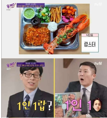예전에 tvN 예능 프로그램 '유 퀴즈 온 더 블록'에서 급식으로 랍스터, 캐비어, 대게 등을 제공한 학교 영양사님이 나온 걸 본 적 있습니다. 나도 교장이 되면 우리 학생들에게 맛있는 랍스터 버터구이를 주겠다고 생각했는데 드디어 오늘 급식으로 나왔답니다.