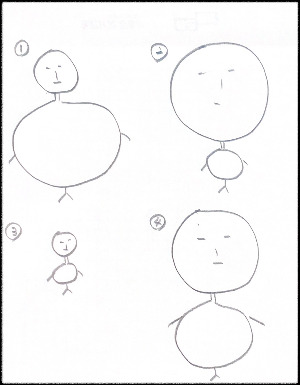 "눈 사람 같아요.", "사람이 모두 이상해요.", "가분수도 있고 머리가 작은 사람도 있고..."