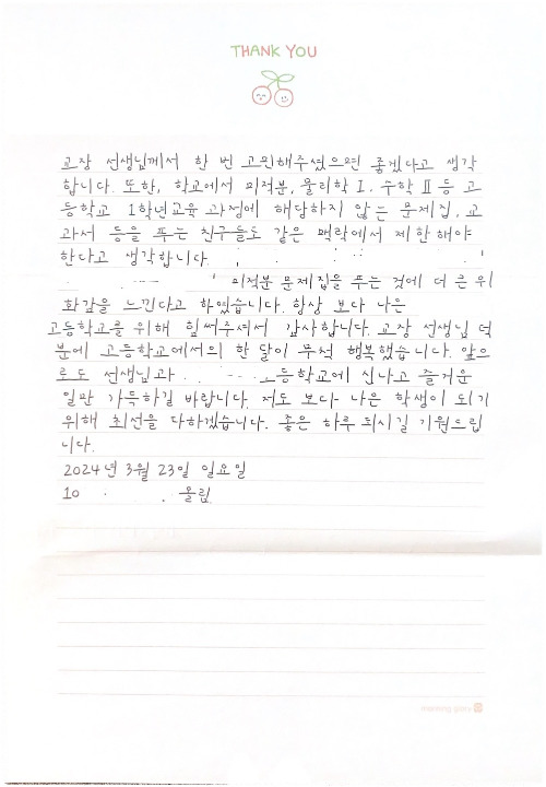 휴대폰으로 짧은 문자나 카톡만 보내고 긴 단어는 줄여서 쓰는 초 MZ 세대가 이렇게 정성스러운 손편지를 써주어서 너무 행복했습니다. 몇 번을 읽으면서 저도 답장을 해야겠다는 마음을 먹고 못 쓰는 글씨지만 만년필로 또박또박 글을 써서 편지를 건네주었습니다. 학생이 졸업 때까지 멋진 학교생활을 해내기를 바라는 간절한 마음에서요.