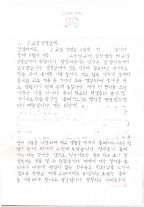 얼마 전에 신입생 한 명이 교장실에 들어와 예쁜 손편지를 제게 주고 갔습니다.