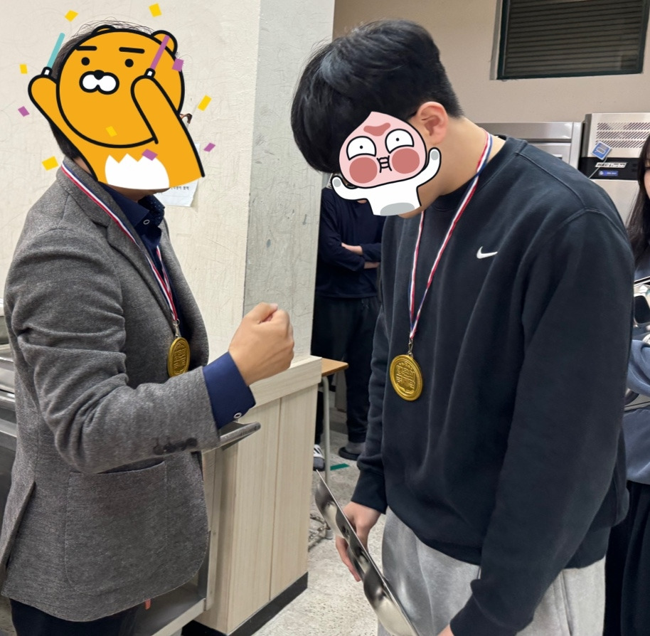 우리 학생들을 응원하는 좋은 이벤트가 없을까 고민한 끝에 수능 전 마지막 급식 먹을 때 수능대박 금메달을 교장이 걸어 주기로 했습니다.