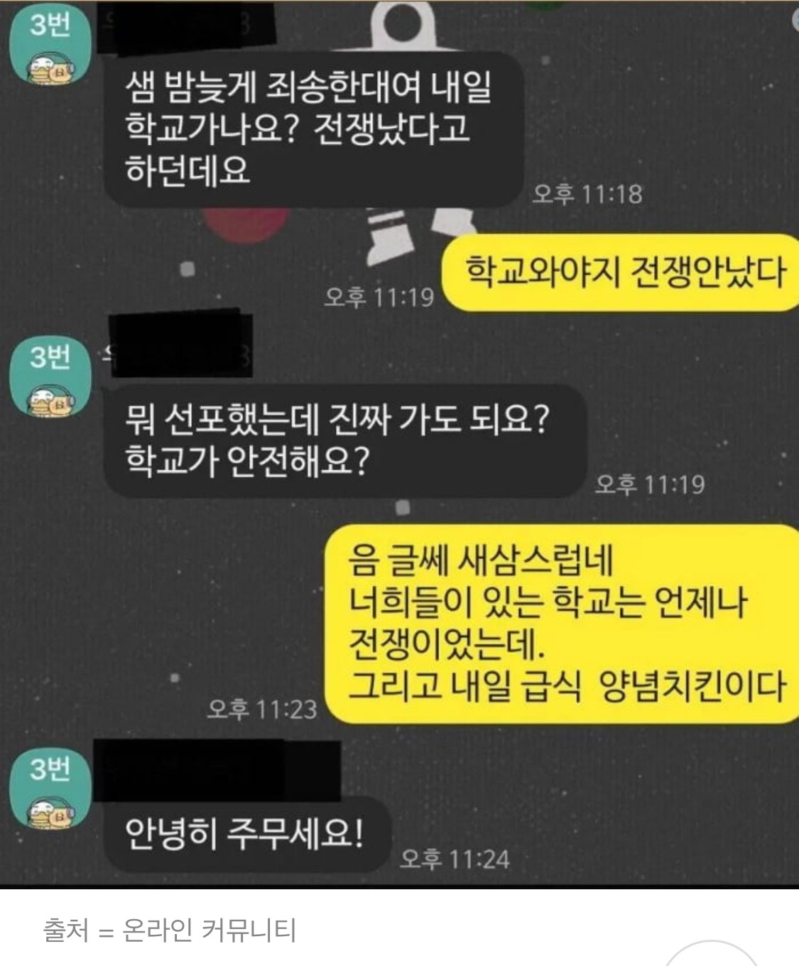 학생 : 샘 밤 늦게 죄송한데요. 내일 학교가나요? 전쟁났다고 하던데요.