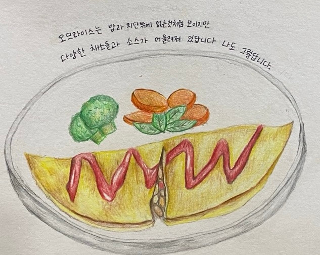 오므라이스는 밥과 지단밖에 없는 것처럼 보이지만 다양한 채소들과 소스가 어울려져 있다. 너도 그렇다.