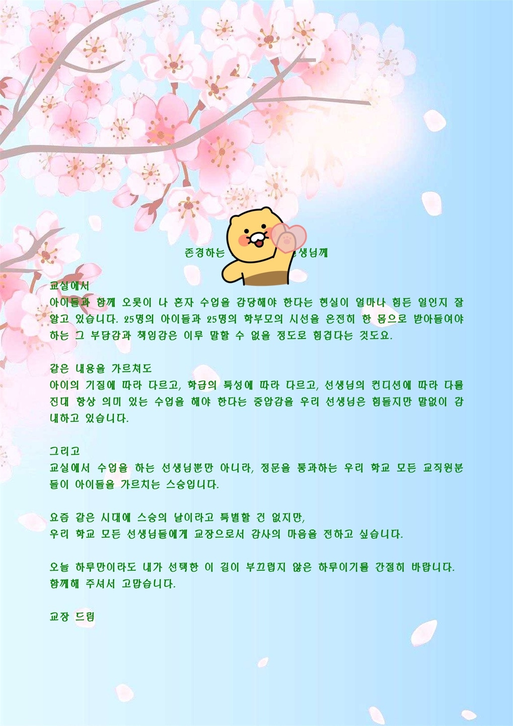 요즘 같은 시대에 스승의 날이라고 특별할 건 없지만 그래도 교장으로서 우리 선생님들께 감사의 마음을 담아 편지를 드렸습니다.