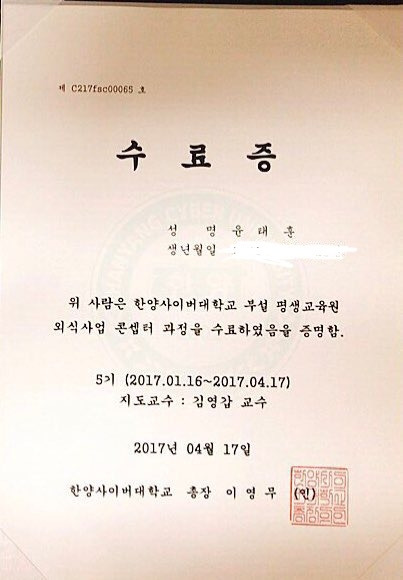대학원 과정에 바로 가고 싶었지만, 아내에게 대학원에 간다고 말할 자신이 없었다. 6년간 공부를 하겠다는 마음을 가지긴 했지만, 실행하지 못하고 있었기에, 갑자기 대학원에 간다고 말할 수는 없었다. 그래서 우선 평생교육원 과정에 등록하였다. 준비운동이라고 생각하고, 먼저 출석과 강의를 듣는 기본적인 일에 익숙해지기로 계획을 세웠다. 출석과 강의를 듣는 일, 다시 공부하는 일에 익숙해진다면, 그다음에 대학원에 가는 것으로 마음을 먹었다. 그래서 우선 한양사이버대학교 평생교육원의 “외식 콘셉트 과정”에 등록하고 수강하기 시작했다.