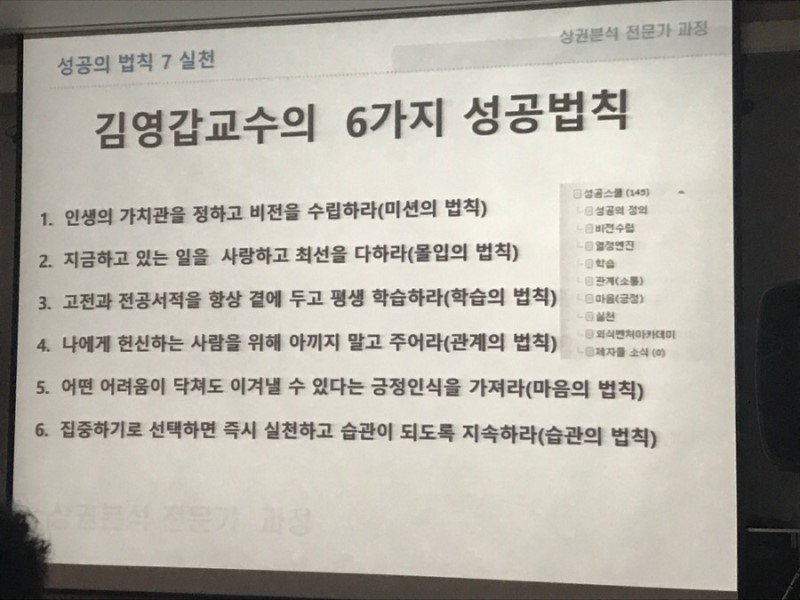 첫 번째, 교육과정을 끝나갈 즈음, 평생교육원에서 진행하는 다른 교육과정을 신청하고 수강하기 시작하였다. 바로 상권분석 전문가 과정이다. 대학원 모집은 2017년 6월로 예상되었다. 외식 콘셉트 과정이 4월 중순에 마무리될 예정이었다. 공부하는 습관을 들여가고 있는 시점에 흐름이 끊기는 것이 싫었다. 또, 데이터 분석에 관심이 많던 차에 상권분석 전문가 과정에 등록하였다. “상권 입지 분석을 기반으로 전략 수립 능력을 키운다.”는 목적 아래 상권 입지와 관련 데이터를 분석하는 방법을 교육하는 과정이었다. 같은 외식 프랜차이즈 브랜드의 매장이어도 입지에 따라 전략을 다르게 실행해야 원하는 매출과 수익을 얻을 수 있다는 것을 업무 경험상 익히 알고 있었기에, 상권분석을 전문적으로 배워보고 싶었다. 4월 초에 개강하고, 6월 말에 끝나는 12주 과정이었다. 이전 과정을 수강할 때와는 달라졌다. 공부에 관심을 더욱 가지게 되었고, 충실히 강의를 듣게 되었다. 첫 번째 과정은 단순히 강의 수강이 목표였다면 두 번째 과정은 과제를 하고 발표까지 하는 것이 목표였다. 그래서 주말에 시간을 내어 과제를 하기 시작하였다. 그러던 차에 교육 과정에서 총무 역할을 맡게 되었다. 이는 강의를 더 열심히 듣게 되는 계기가 되었다. 왠지 총무이기에 과제를 해야 할 것 같은 책임감을 느꼈다. 결국, 그 책임감에 12주 강의가 끝나는 날에 배운 내용을 정리, 활용한 사례를 발표하기로 목표를 세웠다.