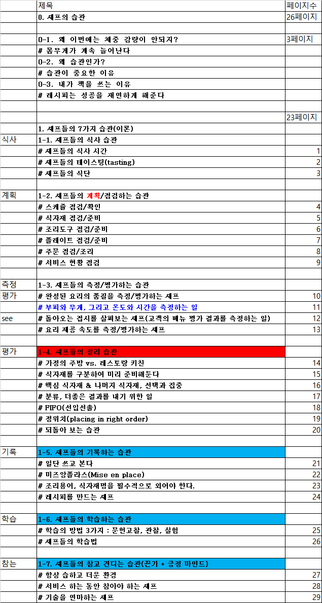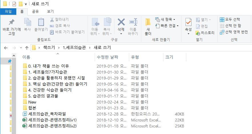 2018년 6월에 다니던 직장에서 퇴사를 했기에 시간 여유가 있었다. 이제부터는 글을 쓰기만 하면 되는 거였다. 먼저 목차부터 만들었다. “습관”, “실행”, “결과”로 장을 구성하였다. 많이 변경되긴 했지만, 처음 잡은 목차가 그대로 책으로 이어졌다. 엑셀 시트에 대제목, 소제목 리스트를 만들어, 다 쓴 꼭지 제목을 채우기 시작하였다. 꼭지는 소제목으로 A4용지로 2장~3장 분량의 작은 주제의 글이다. 꼭지를 쓸 때마다 엑셀 시트에 채우기 시작하였고, 쌓여가는 페이지 수를 체크하기 시작하였다. 120페이지를 목표로 쓰기 시작했다. 과거의 경험을 되돌아보고 내용을 정리하고 써 내려갔다.