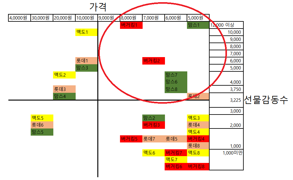 4. 평가 기준 설정(판매량, 선물 감동수, 가격)