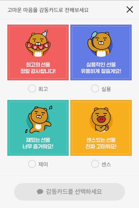 선물을 받은 사람은 선물을 주신 분께 감동 카드를 보낼 수 있습니다.