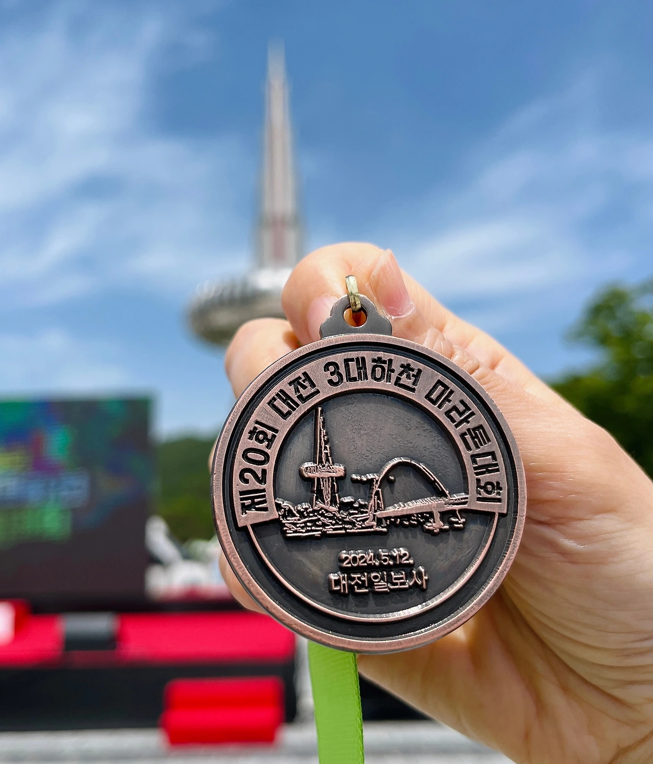 유난히 파란 하늘과 한빛탑을 배경으로 기념샷을 찍고 메달에 이름과 완주기록을 각인해 준다고 해서 거의 1시간 이상 기다려서 각인까지 받아왔다. 이걸 보니 진짜 하길 정말 잘했다. 뿌듯함이 밀려왔다.