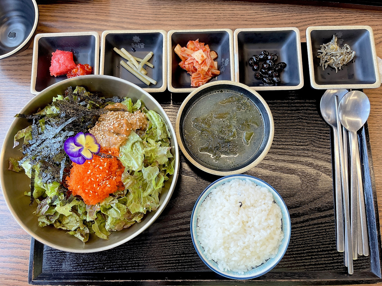 채소가 듬뿍 들어있어서 경쾌하고 성게알이 참기름에 더해져 하얀 쌀밥을 코팅해 한 입 크게 와락 먹으면