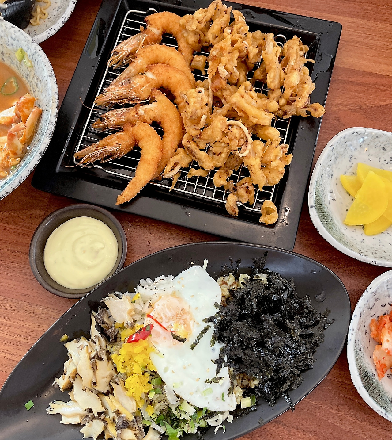 역시 아이들은 튀김이죠. 절대맛의 강자 새우튀김! 오징어 튀김의 맛은 튀김반죽이 조금 매콤해서 튀김 먹고 덮밥 먹고 또 튀김 먹고 덮밥먹고의 무한반복을 했습니다.