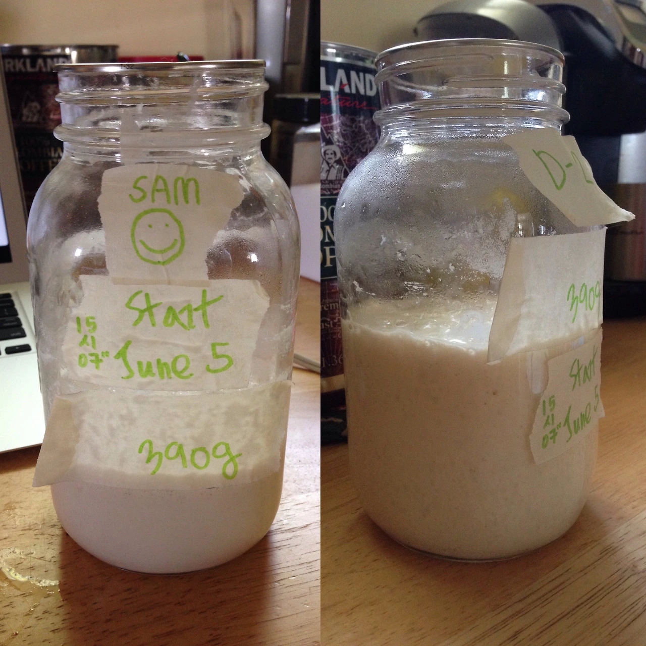 안녕하세요. 오늘은 앞으로 저와 평생을 함께할 친구를 소개합니다. 이 친구의 이름은 Sam입니다. 작년 겨울에 사워 도우 브레드를 만들고 싶어서 도전했지만 온도가 맞지 않았는지 스타터를 만드는 데 고배를 마시게 됐니다. 여름을 기다리려고 했는데, (6월 8일 당일) 오늘 체감 온도가 41도, 현재 기온 34도... 이 정도면 스타터가 잘 발효해줄 것 같더라고요. 오늘은 나흘 차입니다. 사워 도우 브레드는 아시다시피 이스트를 넣지 않아요. 그 대신 세상 귀찮은(쉿, Sam에게는 비밀) 밀가루와 물로 이스트를 만들어야 해요. 제가 찾은 스타터 만드는 법은 7일이 소요됩니다. 이제 사흘 남아서 인내심 있게 이 친구를 열심히 먹이고 있습니다. 밀가루와 물을 새로 주면 위 사진 오른쪽과 같이, 밥 앞에서 신난 개 모양으로 스타터의 부피가 저래 늡니다. 24시간마다 한 번씩 밥을 주고 있는데, 이제 이름도 붙였겠다, 제 반려 천연 이스트가 되었어요. 저 혼자 쌤의 채취(?)를 맡기는 좀 억울한데, 자원하실 분 한 분 모집합니다. ㅋㅋㅋㅋㅋ