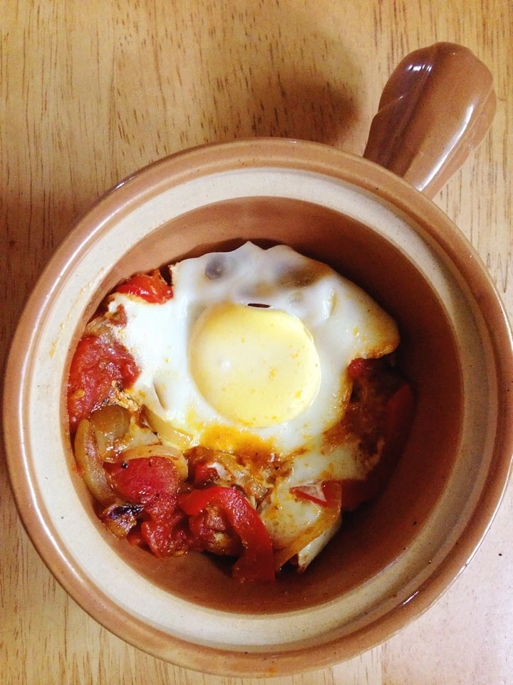 분명 더운 날에는 요리를 피해야 하지만, 시리얼만 먹고 살 수도 없고, 샐러드를 하기엔 이틀간 가도가도를 먹은 탓에 풀떼기라고는 캔 토마토와 양파 그리고 어제의 잔해인 파프리카 조금이 다다. 그리하여 점심은 터키 음식인 삭슈카 shakshuka를 했다. 15분 정도면 완성 가능한 간편한 음식이다. 사실 터키 음식으로 삭슈카를 연재하려고 했으나 이미 이전에 구운 감자인 컴피르 kumpir를 다뤘기에 kill.