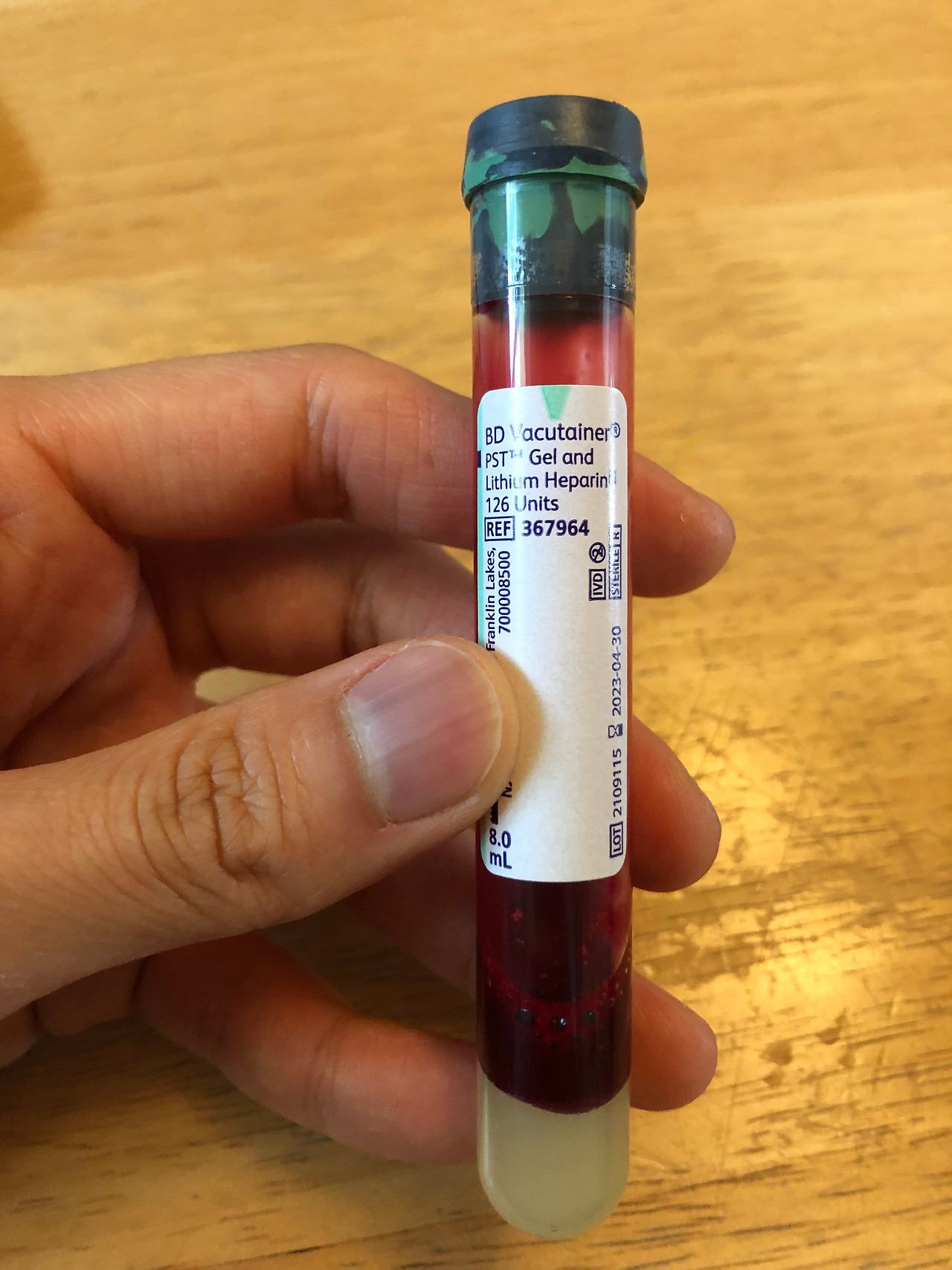위의 사진은 제 배우자의 피입니다. 어제는 학교 랩에서 동기들의 정맥을 채혈했는데요, 저 또한 오른팔, 왼팔을 내어주었습니다. 오른쪽을 맡은 친구는 실수가 조금 있었지만 무사히 성공했고요, 왼쪽 친구는... 긴장을 워낙 해서 중간중간 실수하는 부분이 많았는데요, 성공적으로 채혈하지는 못 했습니다. 친구가 긴장을 하는 게 저에게도 느껴지고, 자신 없어 보이는 모습에 저 또한 긴장이 돼서 앉아있는 동안 입의 침이 마르고, 똥줄이 타더군요. 이래저래 아픈 건 매한가지인데 다음 주에는 침착하고 조용히 지켜봐 줘야겠어요.