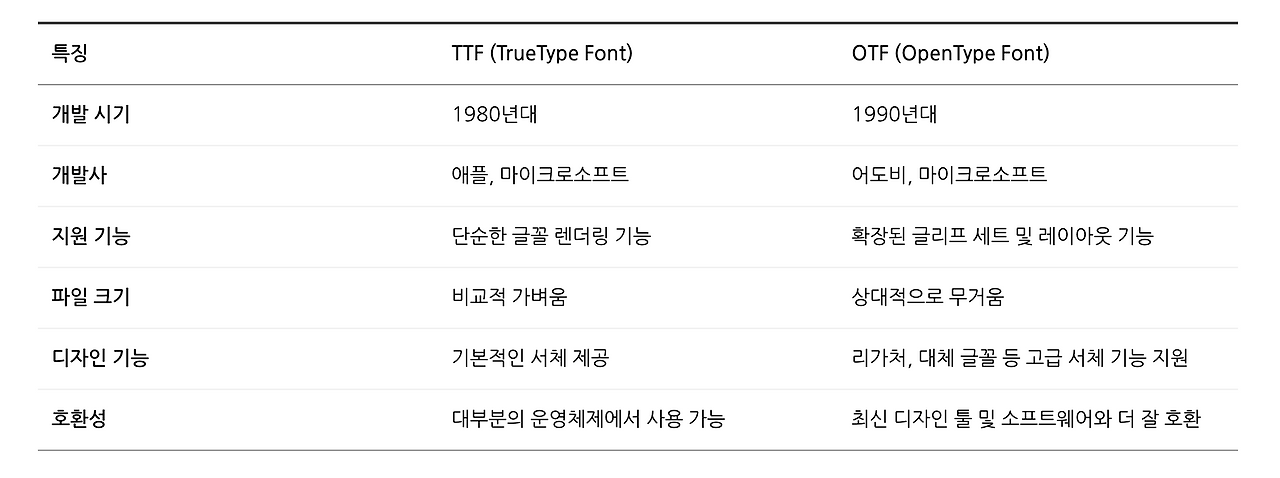 TTF가 초기에 만들어졌고 OTF는 어도비가 이후 고도화를 통해 발전시킨 폰트 형식이다.