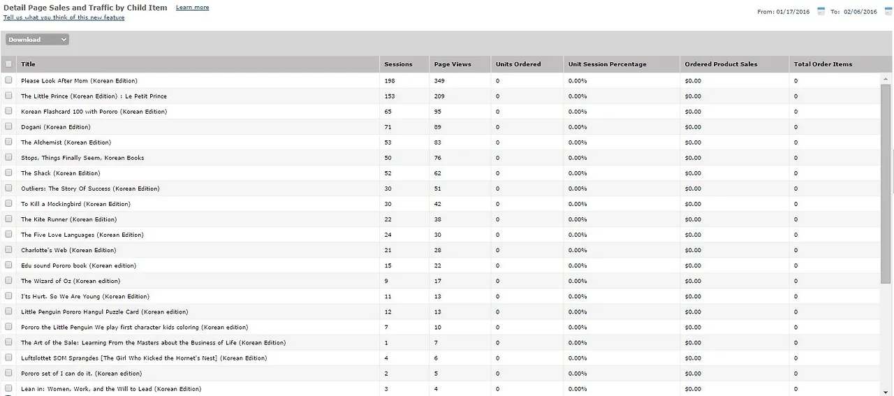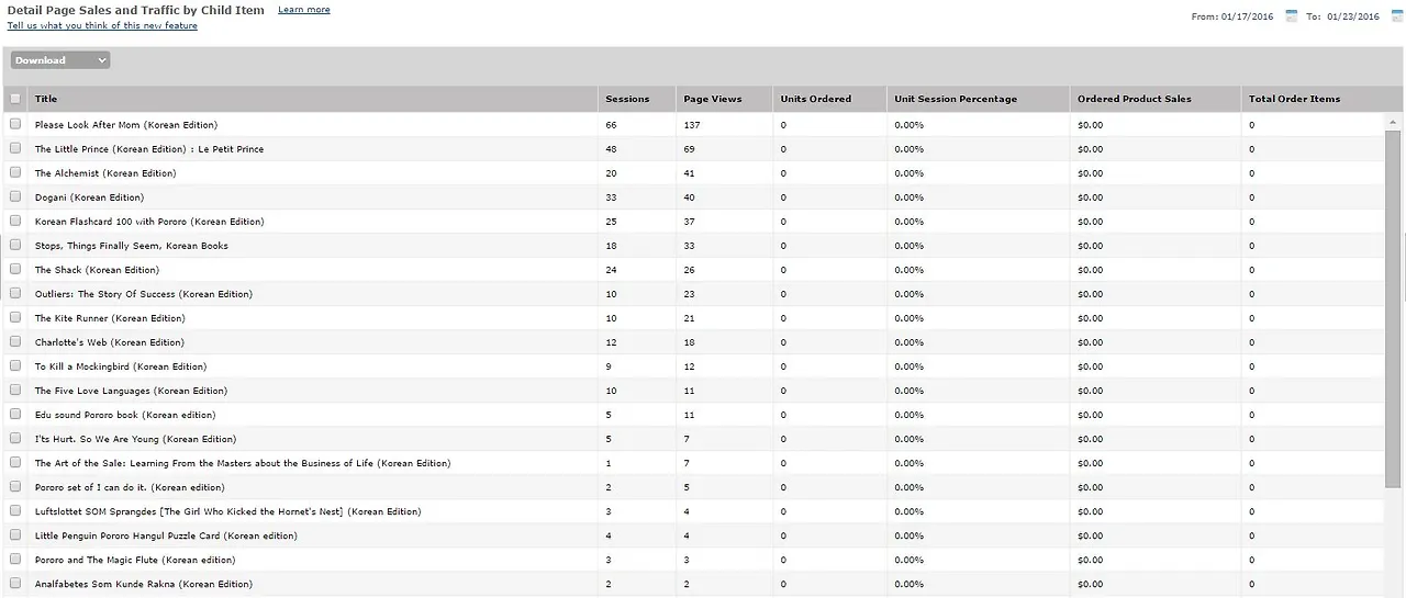 왜 슬픈 예감은 틀린 적이 없는 걸까!? 일주일 동안 Page View가 100을 넘은 것은 Sales Rank가 가장 높았던 엄마를 부탁해 뿐이었다. 그나마도 동일 유저의 중복 접속을 제외한 순수한 Session은 100에 훨씬 못 미치는 66밖에 되지 않았다. 그래 뭐, 아마존에서 한국어로 된 책을 찾는 사람들이 많을 거라곤 기대하지 않았다. 수요의 절대량이 많진 않더라도 아마존이라는 미국 온라인 쇼핑몰에서 한국 책을 찾았다는 건 정말 '필요한' 경우일 것일 거고, Conversion이 다른 상품보단 높을 거라는 것이 내 가정이었기 때문에 일단 시간을 좀 더 두고 지켜보자는 마음으로 2주, 3주째까지 기다렸다.