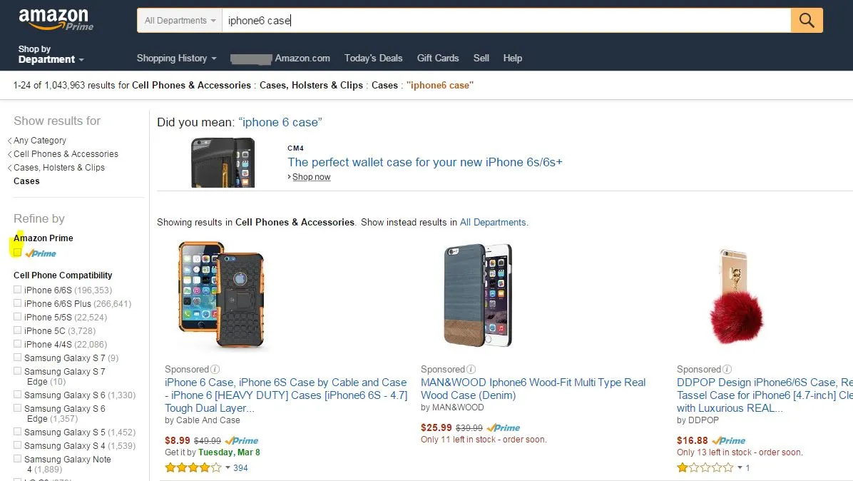 게다가 Prime Membership 가입 고객들은 Non-member보다 Amazon에서 더 많은 금액을 소비한다. (평균 $1,100 vs. $600) 그도 그럴 것이 $99의 멤버십 이용료의 본전을 생각하면 연 간 의식적으로 15회 이상의 구매를 하려 할 것이고, 이를 위해 자주 Amazon에 접속하다 보면 계획된 소비든 충동구매든 더 많은 구매가 일어나게 마련이다. 그나저나 그렇다면 이 Prime Membership이 FBA와 도대체 무슨 관계란 말인가? Prime Membership을 통해 이틀 내 무료배송을 받을 수 있는 상품은 Amazon FC에서 직접 배송되는 경우에 한정된다. 즉, 3rd Party Seller가 직접 배송하는 상품은 이 혜택에서 제외되고, Amazon이 직 매입하여 판매하거나 FBA를 이용하는 Seller의 상품만이 이틀 내 무료배송이 되는 것이다. 또한 Prime Membership 가입자 입장에선 당연히 Prime 로고가 붙은 상품 위주로 구매를 하려 할 것이고, Amazon도 이러한 그들의 특성을 반영하여 검색 결과 내에서 "Prime" 상품만을 별도로 모아볼 수 있는 필터 기능도 제공한다.