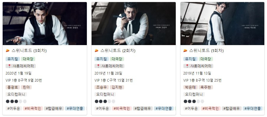 <스위니 토드>는 2007년 국내 초연 이후 2019년 삼연을 마쳤다. 올해(2022년) 사연으로 돌아온다는 소문이 있다. 나는 2019년에 6명의 주연배우를 모두 만나기 위해 총 3회 관람했다. 이 시즌에 무대 디자인이 크게 바뀌었다. 그전까지 수직과 수평의 구조물로 차가움과 딱딱함이 특징이었던 무대 디자인은 퀴퀴한 19세기 유럽의 분위기로 다시 디자인되었다. 팀 버튼이 연출한 영화 <스위니 토드> 분위기와 유사하다. 바뀐 무대 디자인이 <스위니 토드> 특유의 어둡고 습한 분위기를 더 잘 살린 듯 하나, 나름대로 독특했던 과거 무대 디자인을 직접 보지 못해 아쉽다. 무대디자인에 대한 이야기는 '더 뮤지컬' <스위니 토드> 무대디자인, 살인마 이발사가 사는 곳에서 자세히 읽을 수 있다.