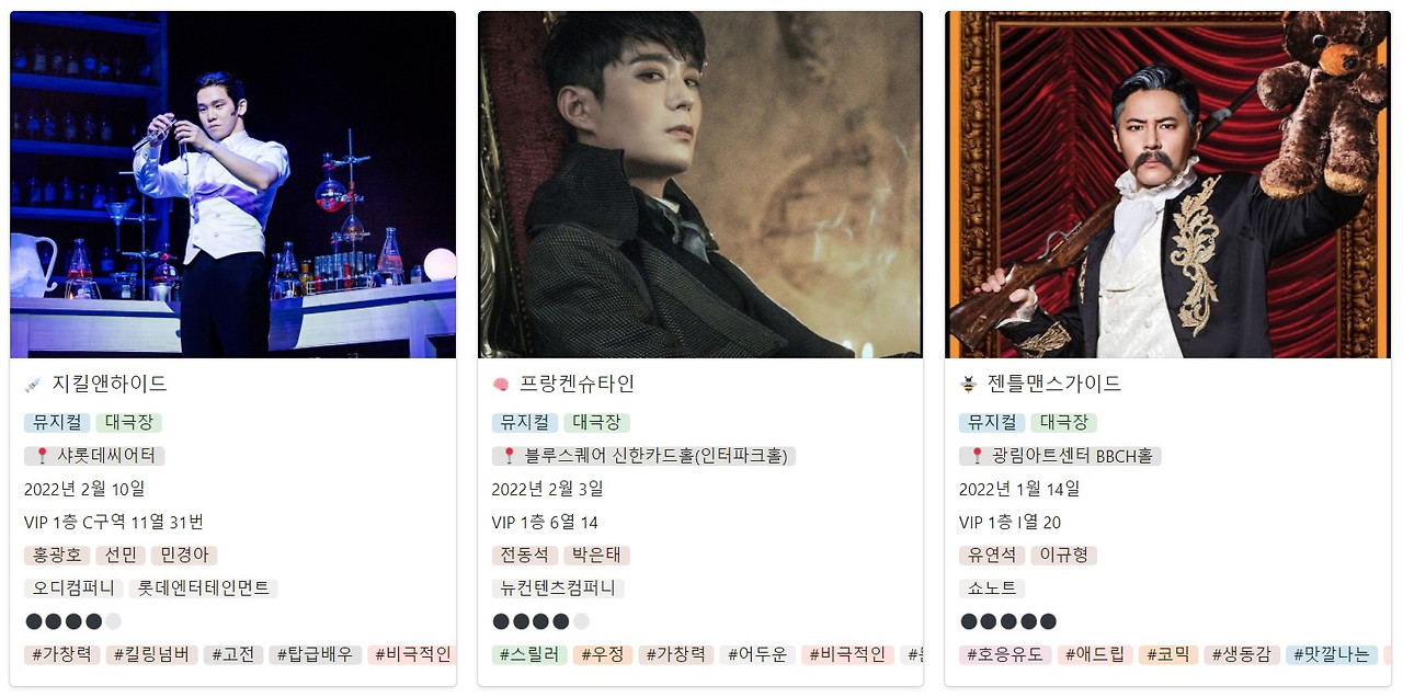 피규어 수집가들은 집안 가장 잘 보이는 곳에 피규어를 전시한다. 뮤지컬, 연극, 콘서트, 2-3시간 남짓의 시간이 지나면 휘발되고야 마는 이 취미를 가만히 자리를 지키는 피규어처럼 어딘가 전시하고 싶었다. 가지런히 정렬되어 있는 카드가 ‘참 보시기 좋았더라’ 할 수 있으면 그만이었다. 그런데 시간이 지날수록 이거 생각보다 유용하다. 소소하게 유용하다.