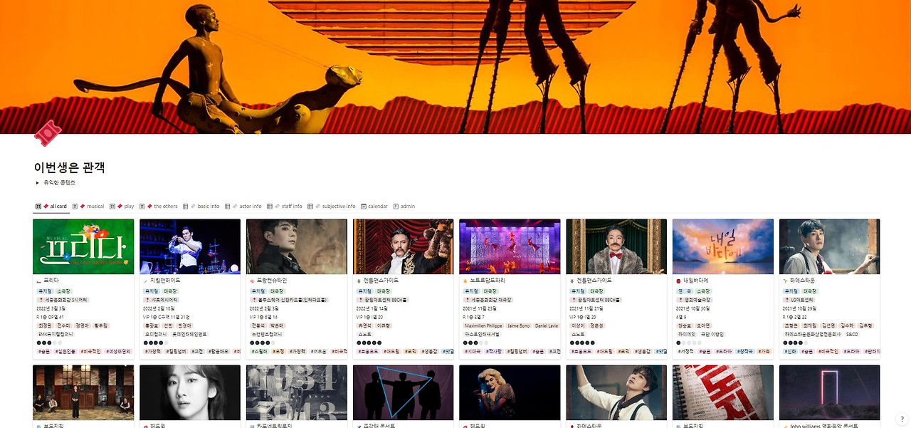 노션은 같은 데이터베이스를 여러 가지 보기 방식으로 나열할 수 있다. 표, 보드, 타임라인, 캘린더, 리스트, 갤러리 6개의 보기 방식이 있다. 페이지가 하나의 카드로 만들어져 전체를 훑어보기 좋은 '갤러리 보기' 모드가 내 노션 페이지의 메인화면이다. '갤러리 보기' 모드는 공연 장르에 따라 구분했다. '표 보기' 모드는 상세 내용을 선택적으로 확인하기 편하다. 배우진이나 제작진에 대한 상세 정보를 '표 보기' 모드를 통해 살펴보곤 한다. 데이터 계산값도 볼 수 있다.