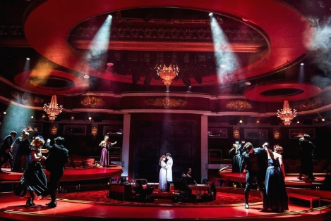 이머시브에 대해 이야기할 듯하더니 무대 생김새에 대해 왜 이렇게 길게 이야기했냐면, 이 무대가 ‘이머시브’를 위해 제작사에서 얼마나 노력했는지 잘 보여주기 때문이다. 다만, 노력이 매번 훌륭한 결과를 낳는 것은 아니다. 앞서 이야기했듯이 무대 위에는 관객석이 있다. 무대 위 관객석의 대부분은 무대 전면 관객석과 마주 보도록 배치돼 있다. 무대 위 관객들은 나처럼 마스크를 쓰고 나란히 앉아 있다. 마스크를 쓰고 자신의 앞에서 신나게 춤추는 배우를 보고 있는 관객석의 관객들이 참으로 현실적이었다고 할까. 나는 뮤지컬을 보면서 현생을 잊고 무대 위 세상에 완전히 몰입하는 경험을 좋아한다. 그런데 <그레이트 코멧>의 무대는 현생을 잊도록 도와주지 않았다. 나의 시야 안에서 배우들의 몸짓에 호응을 할 수도 없이 그저 배우를 바라보고 있는 관객들을 보는 마음이 씁쓸했다. 현생의 상황에 의해 우리 사이가 거리가 기어코 좁혀질 수 없다면 그냥 멀어지 기를 택하고 완벽한 내 판타지 속 세상을 만들어주지 그랬어, 원망스러웠다.
