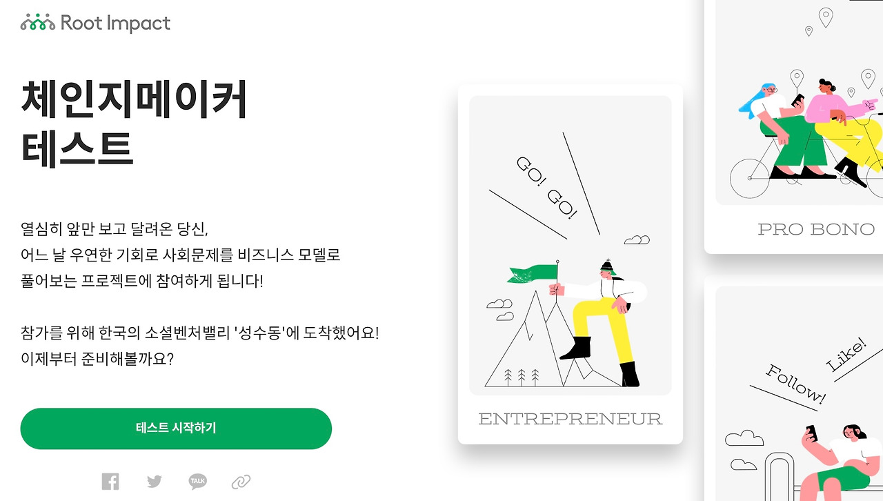 너네 회사는 무슨 일 해? 라고 물었을 때, "빈곤문제를 해결하는 조직입니다." "기후위기문제를 해결하는 조직입니다."와 같은 설명을 들을 줄 알았을 텐데, 루트임팩트 구성원들은 "체인지메이커가 뭐냐면~"부터 시작해야 한다. 그것이 우리의 숙명.