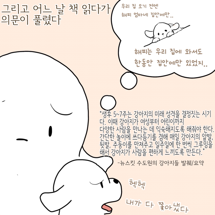 해피를 데려오던 2008년에 좀 더 강아지에 대해 많이 공부하고 준비된 상태에서 해피를 맞았으면 얼마나 좋았을까 늘 후회하곤 합니다.