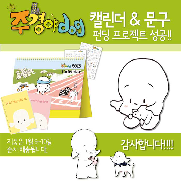 으아 오늘은 기쁜 소식! 주경야dog 캘린더와 노트, 스티커가 드디어 제작되어 1월9-10일에 배송된다고 해요! 스티커는 오프라인에서도 판매하고요*_* 오래 기다려주셔서 고맙습니다. 저도 실물은 못봐 너무너무 궁금한데 이쁘게 나왔다고 하니 조금만 더 기다려주세요! 그리고 오랜만에 웹툰도 업로드 되었습니다!