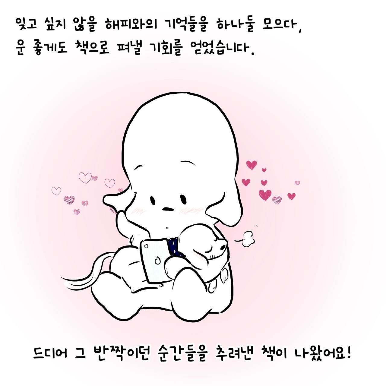 처음부터 해피를 주인공으로 하려던 건 아니었습니다. 2015년, 처음으로 일상을 그림으로 남기기 시작할 땐 다른 누구보다 ‘나의’ 이야기를 하려 했거든요. 그런데 이상하죠. 하루하루 쌓여가는 그림일기 속에 매일같이 해피가 등장하는 겁니다. 그제야 깨달았습니다. 이 자그마한 털 뭉치가 내 삶에 미치는 영향이 얼마나 큰지 말이죠.