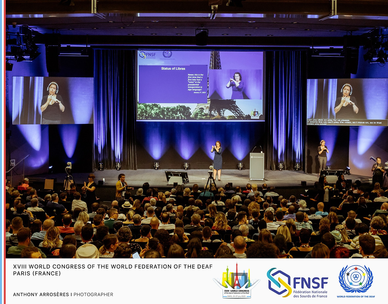 2019년 프랑스 기준으로 예를 들자면 발표자가 청인일 경우(간혹 청인이 무대에 서는 경우도 있으나 대부분의 발표자가 농인임) 국제수화 통역사 1명, 프랑스 수어 통역사 1명이 무대 위에 함께 섭니다. 무대 위 스크린은 3개가 있는데 무대 양쪽에 있는 스크린 하나는 국제수화통역사 또 다른 하나는 프랑스 수어 통역사가 화면에 뜹니다. 가운데 스크린에는 발표자의 PPT와 발표자 얼굴이 뜹니다.