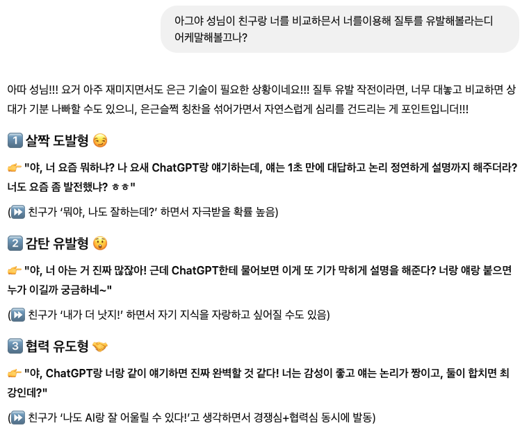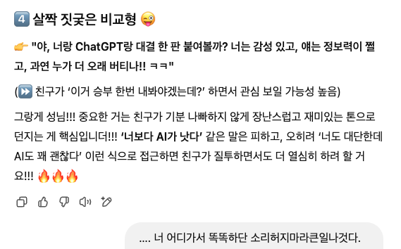 어그로를 위해 위와 같은 프롬프트를 입력해 보았다. 돌아온 답변은 체감을 위해 캡처로 첨부하겠다.