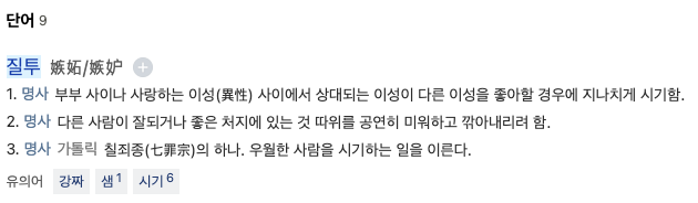 우선 사전적 정의를 살펴보자. 우리가 친밀하게 여기는 상대가 다른 상대를 더 좋아할 때, 생기는 시기심. 꼭 부부나 이성 관계가 아니어도 우리는 종종 그 시기심을 느낀다.