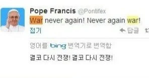 아까 '남자가 필요하다는 간호사'라는 커뮤니티 글을 읽었는데 그 글 댓글 타래에서 교황이 'War never again! Never again war!'라고 말한 걸 '결코 다시 전쟁! 결코 다시 전쟁!'으로 번역한 걸 봤고 거기에 누가 '오직 전쟁'이라고 코멘트를 달았으며 그에 다시 '교황께서 전쟁을 원하신다!', '성전이다, 우매한 이단들아!', '십자군 출격이다'라고 댓글을 단 타 커뮤니티 짤이 있음을 알게 되었다.