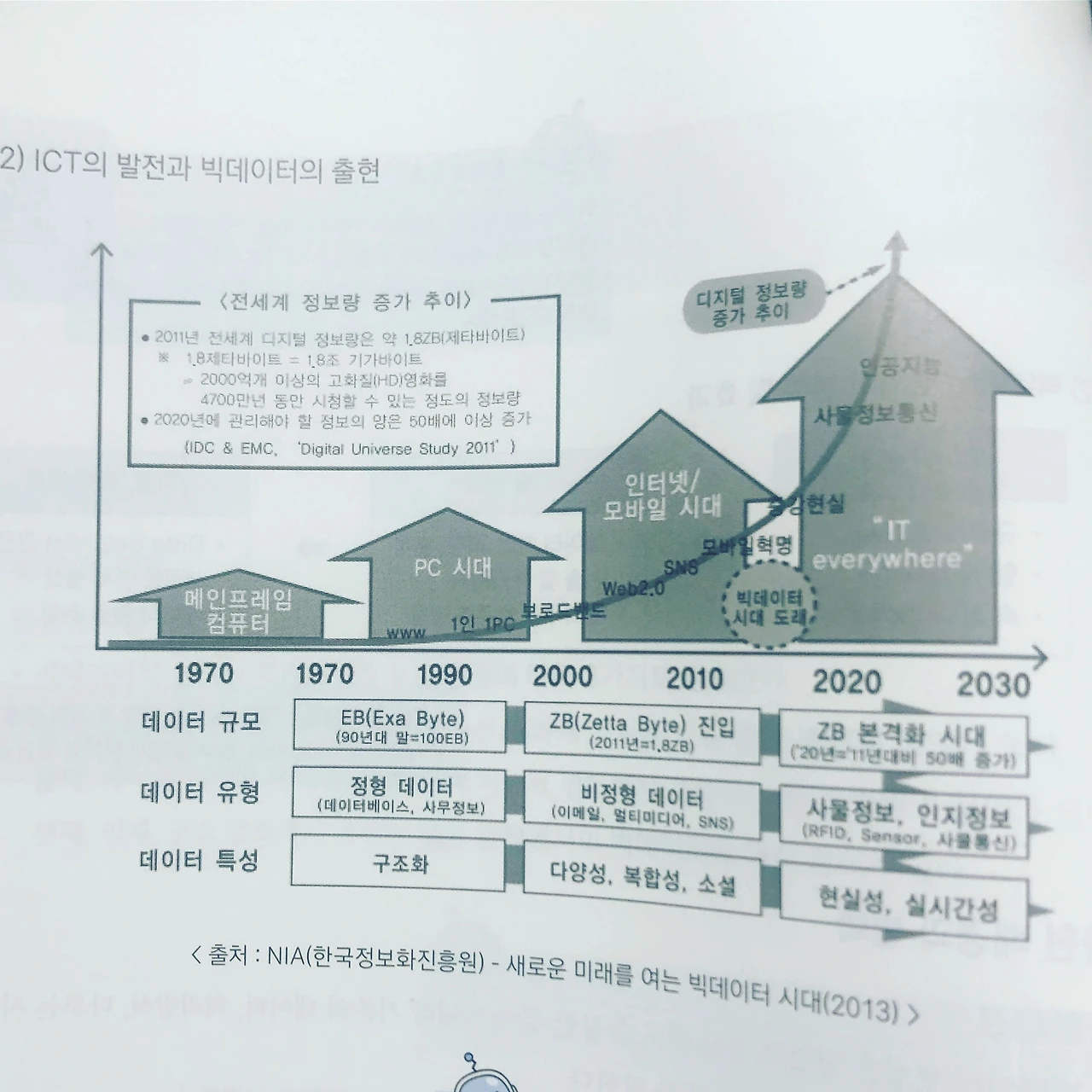 오늘은 어제 4시간 밖에 못 자서 날짜 바뀌기 전에 자려고 했는데 비건 빵 먹고 도라지 차 마시고 디카페인 커피 마시고 ADsP 수험 서적 앞부분을 조금 읽어보았다. 2011년 경 전세계 디지털 정보량은 약 1.8ZB(제타바이트)였단다. 이것은 1.8조 기가바이트인데, 2,000억 개 이상의 고화질(HD) 영화를 4,700만 년 동안 시청할 수 있는 정도의 정보량이며 이것이 2020년에는 관리해야 할 정보량이 50배 이상 증가할 거라고 했는데 지금이 2020년이다. IDC&EMC, 'Digital Universe Study 2011'에 나온 이야기라고 한다. 핸드폰 128GB도 작은 것 같다고 생각하고 있는데, 1.8조GB 무엇? 너무나 엄청난 일이다.