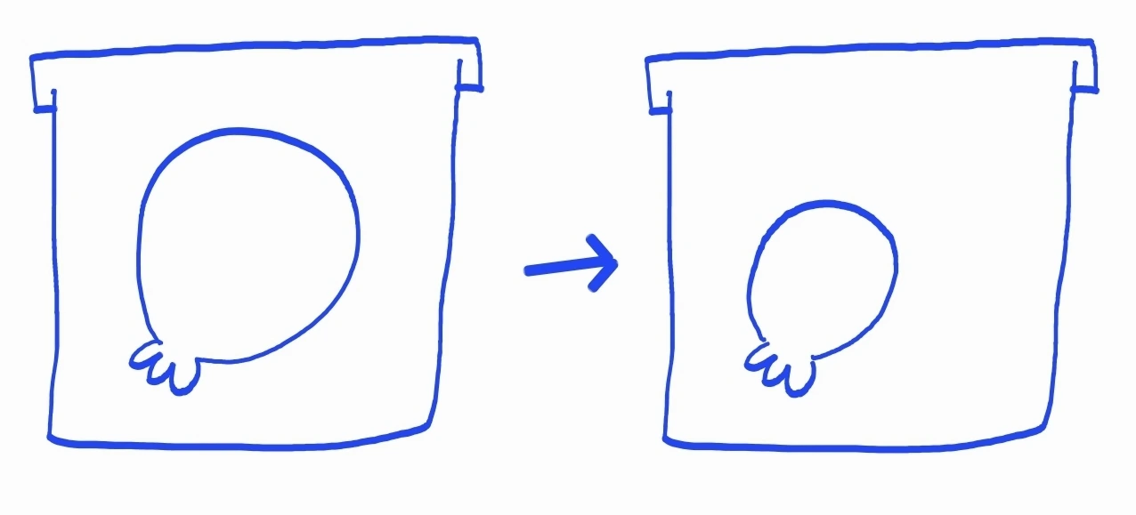 용기에 공기를 주입하니 풍선의 크기가 작아졌다용기 안에 풍선이 있다고 해보자. 이 용기에 공기를 주입하면 풍선 밖 기체 입자가 미는 힘이 커진다. 즉 기압이 높아지는 것. 그러면 풍선의 크기가 작아지다가 어느 순간의 크기에서 멈출 것이다. 그 때 풍선 안에서 미는 힘과 풍선 밖에서 미는 힘이 같아졌기 때문이다.