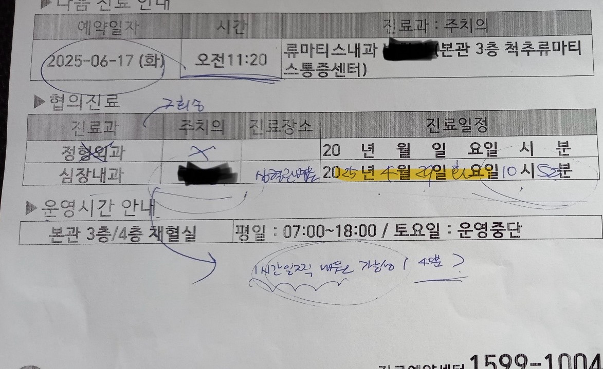현재 다니고 있는 류마티스 담당의가 가능한 한 빨리 혈관 검사 하자고 심장내과 예약을 잡아준다고 해서 4월 29일에 오라고 해놓고 상대과에 노티를 안 해줘서 예약이 되질 않았고 이후 검사 일정이 죄다 꼬여 버렸다.