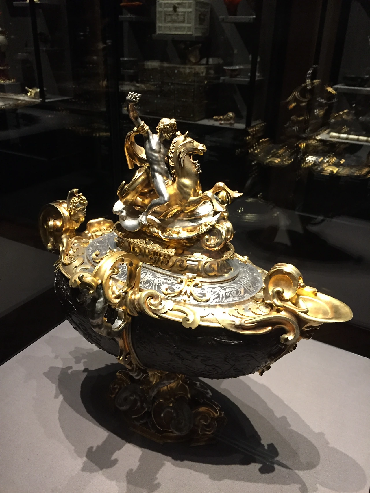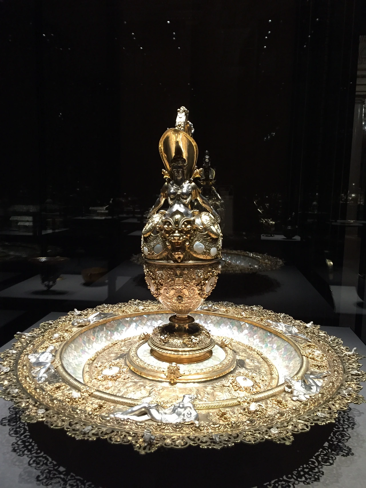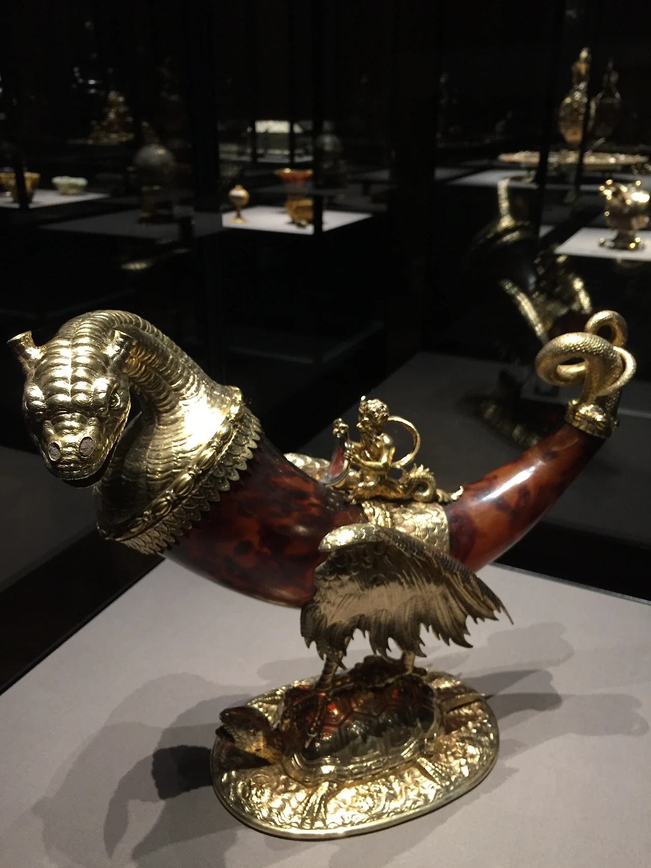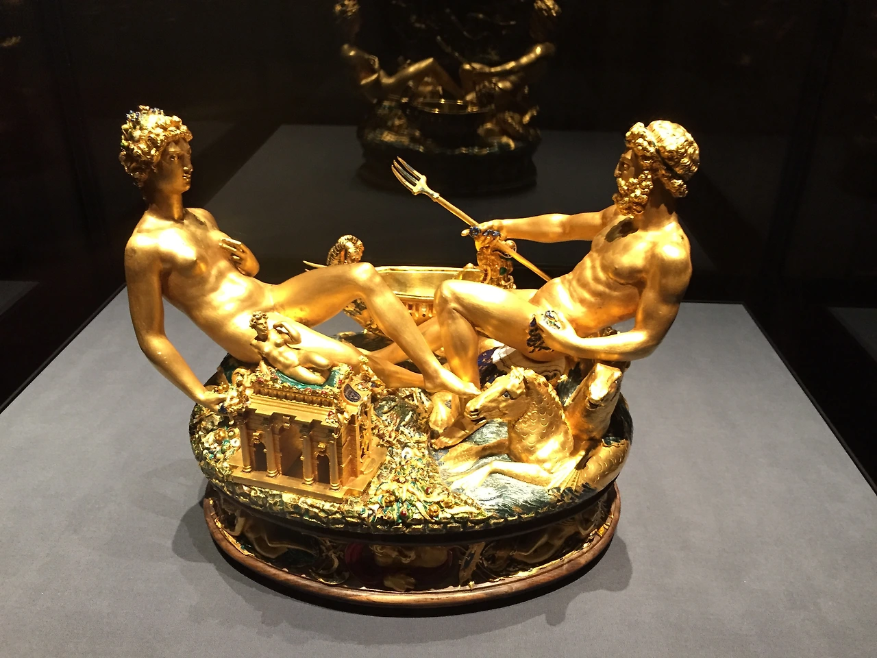 0.5층은 크게 예술공간, 이집트 동양 수집, 고대 유물 수집, 특별 전시로 구성되어있다. 주로 공예품이 많다. 금빛의 화려한 공예품들이 전시실 조명을 받으니 아침 햇살만큼이나 눈이 부시다. 뭔지 모르고 그냥 봤을 땐 장식용으로만 생각했는데 친절하신 오디오 가이드 선생님 말씀에 실용적인 기능이 있는 작품들이란다. 그중 가장 대표적인 것이 티켓에도 나와있는 소금통, '첼리니 솔트 셀라(Cellini Salt Cellar)' 다. 이탈리아 조각가 벤베누토 첼리니(Benvenuto Cellini)의 작품으로 이탈리아어로 소금 그릇을 뜻하는 '살리에라(Saliera)'라는 이름을 가지고 있기도 하다.