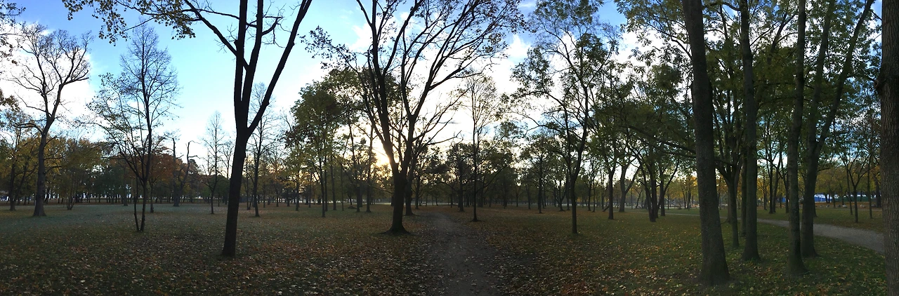 주변이 온통 나무로 둘러싸여 마치 숲 속에 있는 것 같은 착각에 빠져 걷고 있는데 어느 순간 저 멀리 숲이 아닌 도시의 풍경이 눈에 들어오기 시작한다. 잎이 거의 떨어진 앙상한 나뭇가지들 틈 사이로 건물이 하나 보인다. 붉은 단풍색인 것 같기도 하고 연한 노란색 같기도 하다.