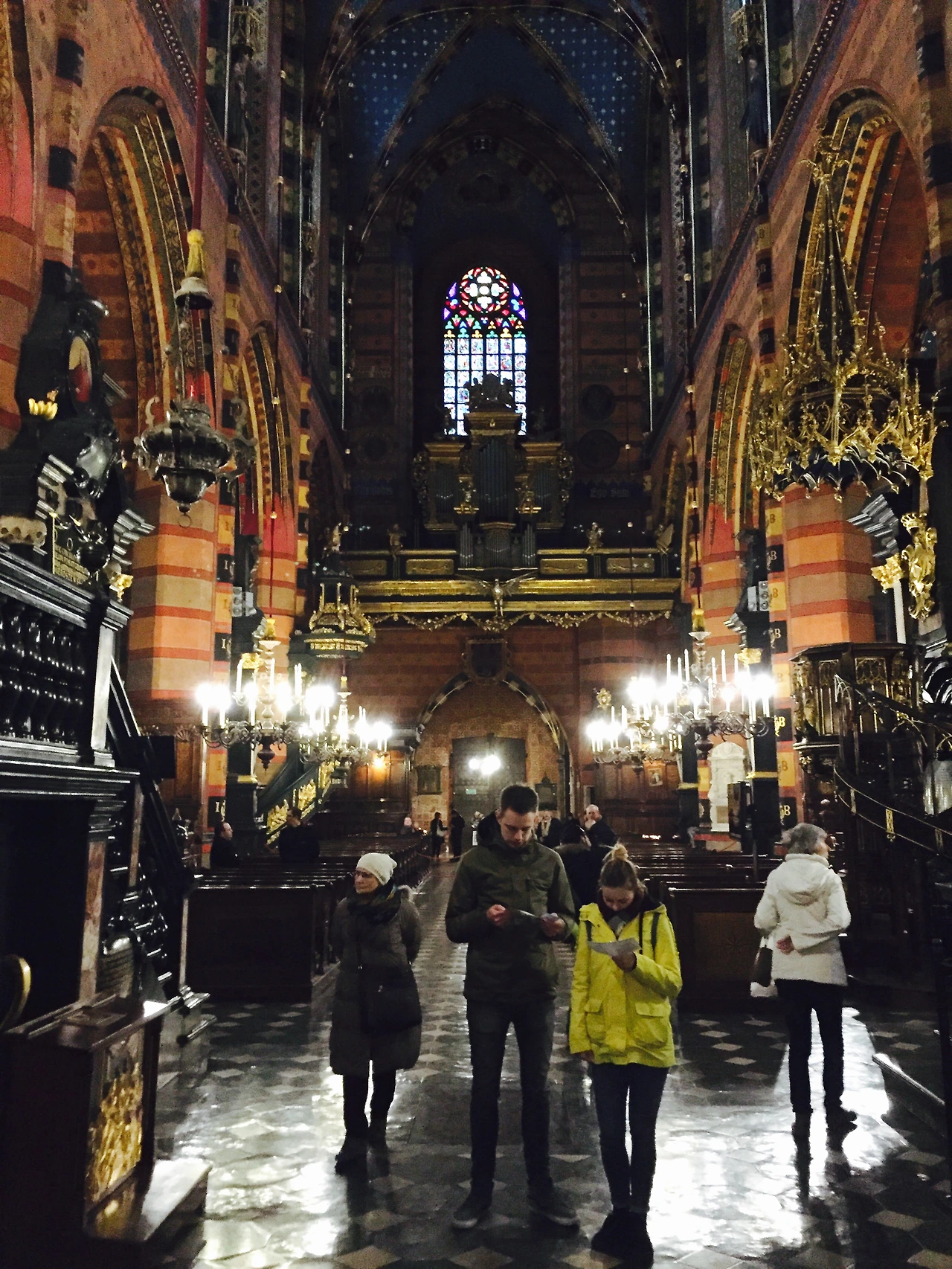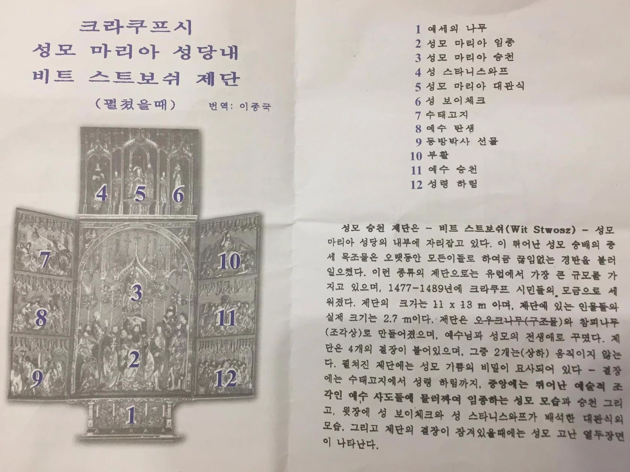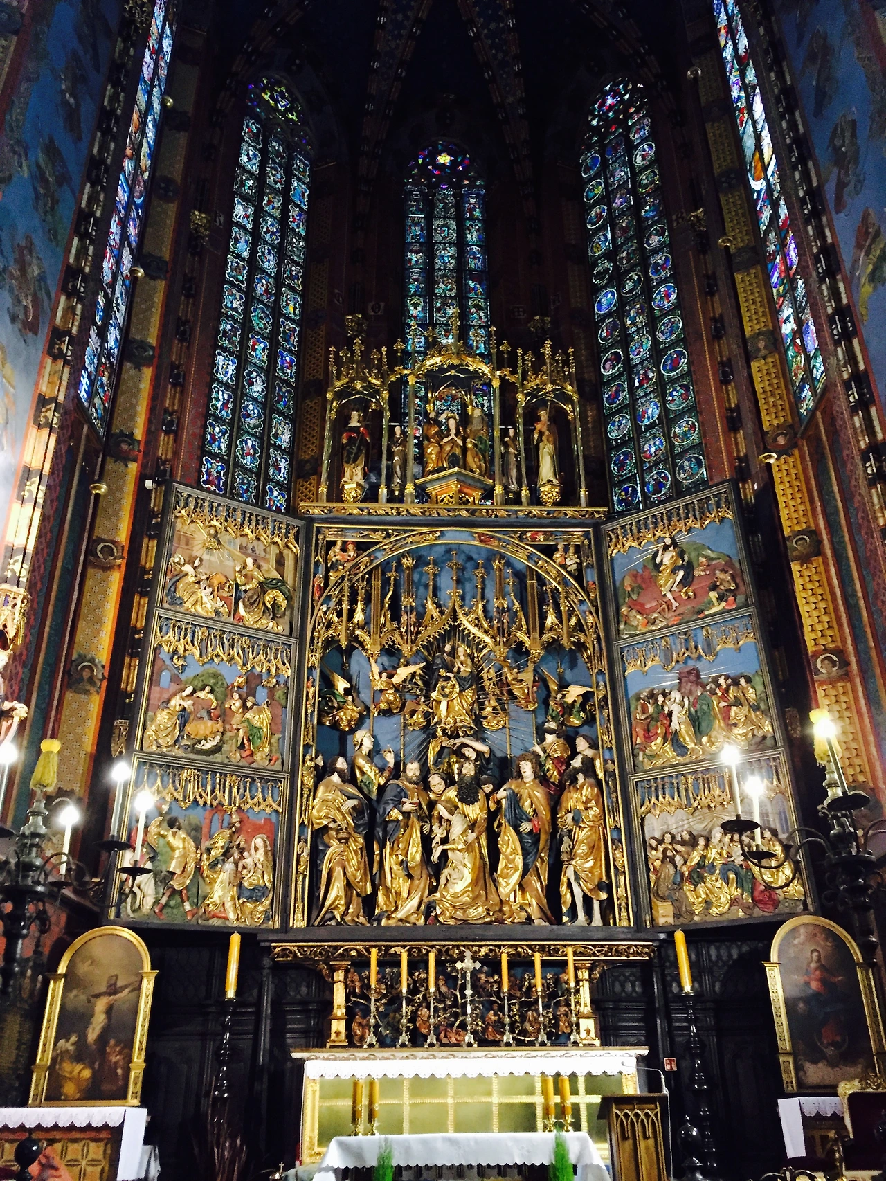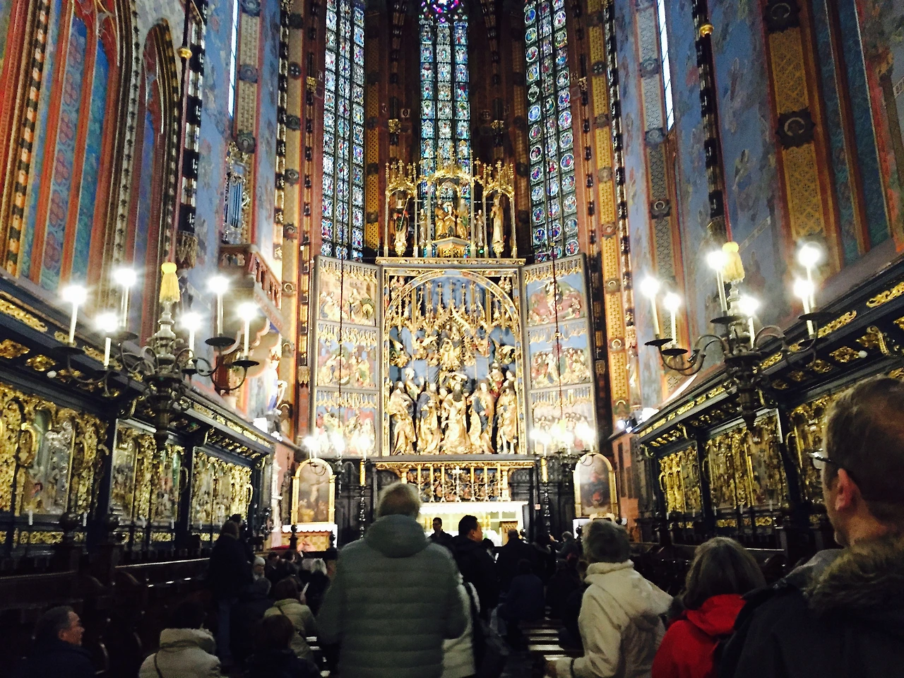 비트 스트보쉬(Wit Stwosz) 제단은 독일의 유명한 조각가인 '바이트 슈토스(Veit Stoss)'에 의해 만들어졌다고 한다. 제단 앞에 서니 일단 반짝반짝 빛나는 황금색에 눈이 휘둥그레진다. 화려하게 빛나는 제단과 그 뒤 알록달록 스테인드글라스의 조화가 아름답다 못해 경이롭기까지 하다.