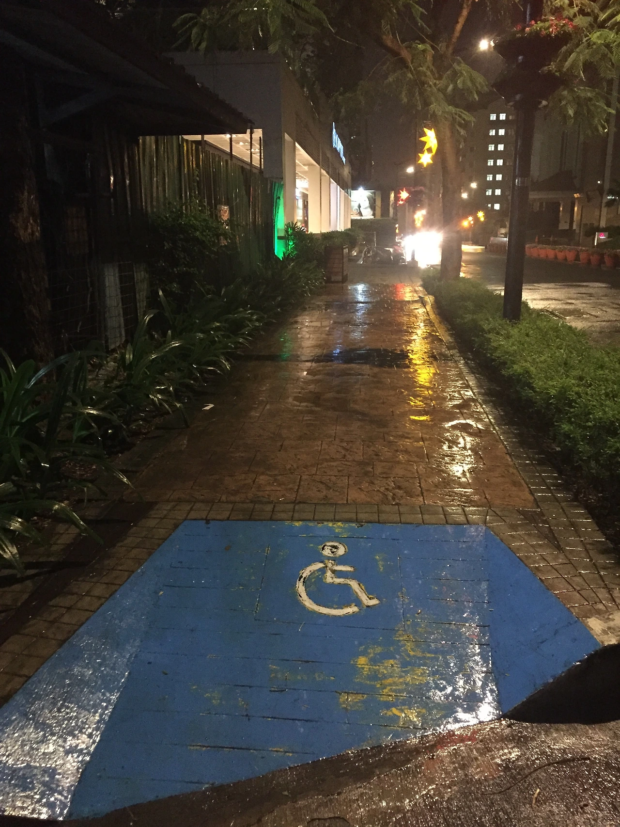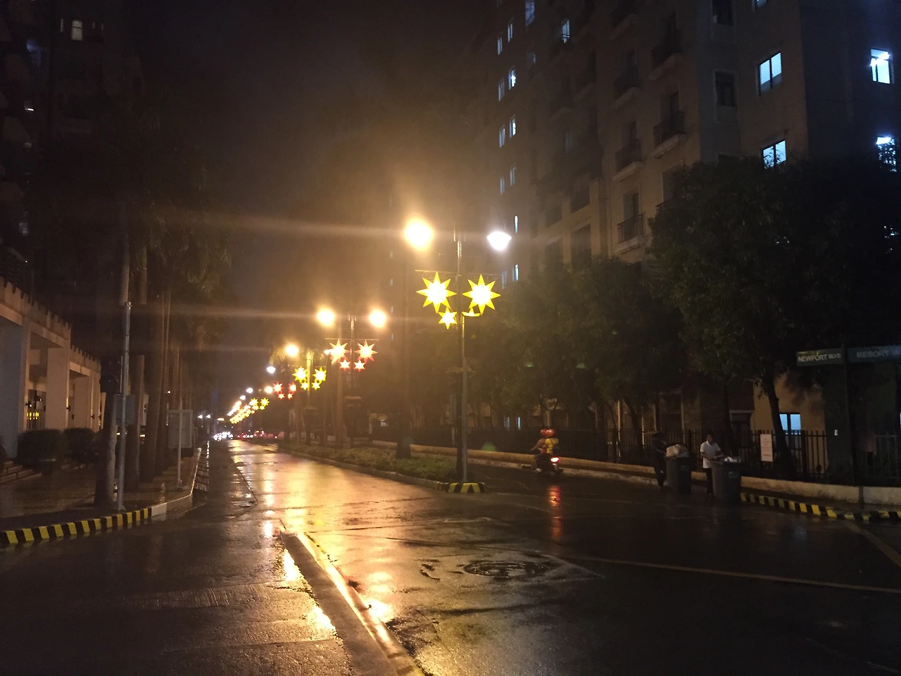 샤워를 하고 나만의 힐링을 하러 밖으로 나왔다. 반바지에 반팔티. 좀 전까지만 해도 긴 옷으로 칭칭 감싸고 있었는데 갑자기 세상 구경을 나온 팔과 다리가 민망한지 나도 모르게 자꾸만 움츠러든다. 하지만 덥고 습한 공기가 피부에 닿으니 금세 긴장이 풀어진다. 활짝! 우산을 펴고 비 내리는 마닐라의 밤거리로 들어간다. 여행 전 필리핀에 대한 위험한 소문들을 많이 들어왔던 터라 혼자인 밤거리가 마냥 편하지만은 않았는데 아니나 다를까 호텔 주변과 거리 곳곳에 경찰들이 서있다. 삼엄하다 싶을 정도의 경비는 아니지만 경찰의 존재가 내게 안정감을 주는 동시에 약간의 삭막함도 가져다주었다. 마냥 아름답지만은 않은 밤이다.