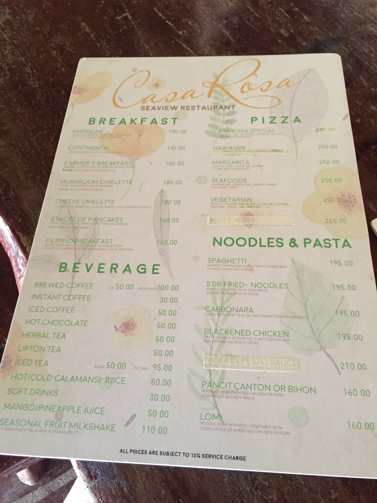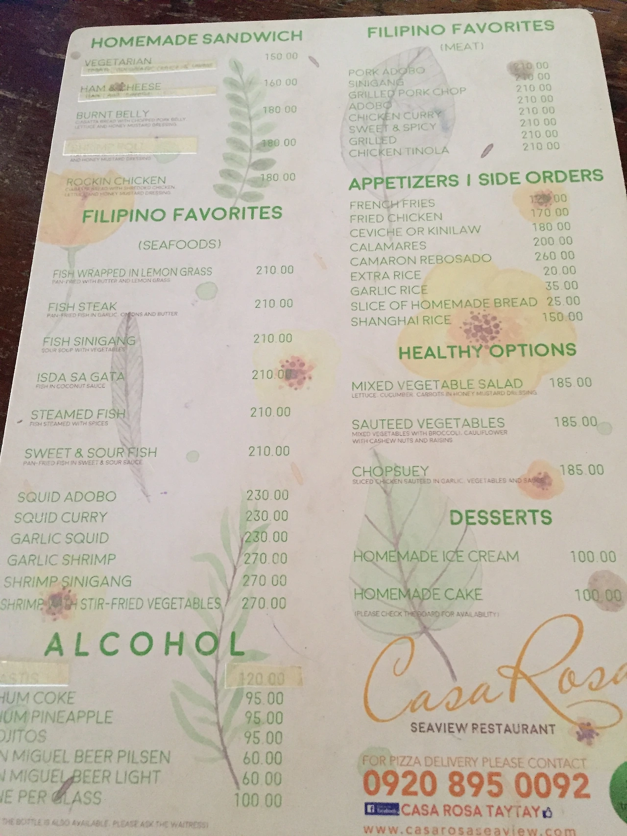 타이타이에 있는 레스토랑이자 숙소다. 이름부터가 스페인이다.(스페인어로 Casa: 집, 가옥 / Rosa: 장미꽃) 그렇다면 점심 메뉴는 스페인 요리?(^o^) 일 줄 알았지만 이름만 그럴 뿐, 필리핀 로컬 푸드에서부터 파스타와 피자까지 맛볼 수 있는 퓨전 레스토랑이다. 해산물, 고기, 야채 등 종류도 다양했다. 여기까지 와서 피자와 파스타를 먹을 순 없는 법. 우리는 필리핀 로컬 푸드를 위주로 주문했다. 물론, 산미구엘도.